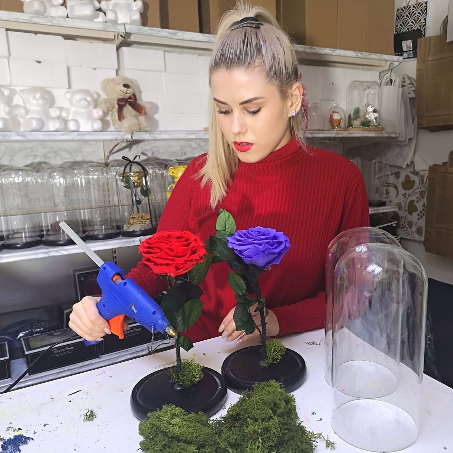 Povestea a început cu mult înainte să apară site-ul meu. Îmi plac foarte mult florile, dar nu îmi plăcea să le primesc cadou, pentru că rezistă doar câteva zile.Când am văzut pentru prima oară un trandafir într-o cupolă de sticlă, pe internet, m-am îndrăgostit instant și am decis să realizez unul și pentru mine. Pe vremea aceea, nimeni nu făcea astfel de lucruri. Norocul meu a fost că, cu câteva luni înainte, văzusem o cupolă goală la un depozit de flori și știam de unde să fac rost de materiale.